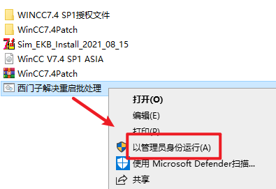 2.打开刚刚解压的文件夹,选中“西门子解决重启批处理”右键选择“以管理员身份运行”