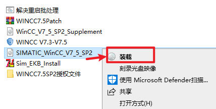 3.选中“SIMATIC_WinCC_V7_5_SP2.iso”文件,右键选择“装载”(如果没有“装载”选项的可以右键选择“打开方式—Windows资源管理器”打开)