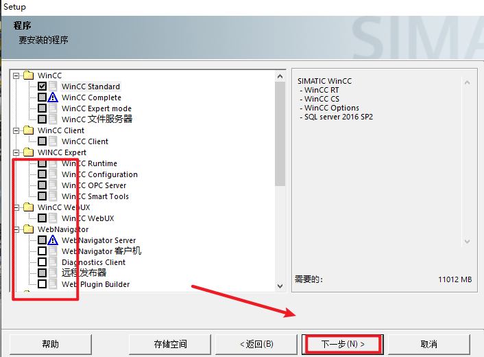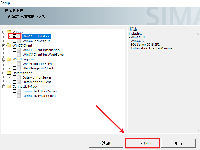 12.勾选“WinCC Installation”,点击“下一步”
