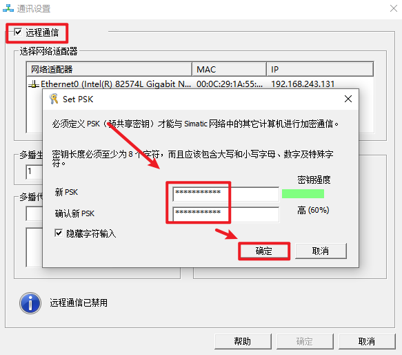 30.重启电脑,勾选“远程通信”,创建PSK,点击“确定“