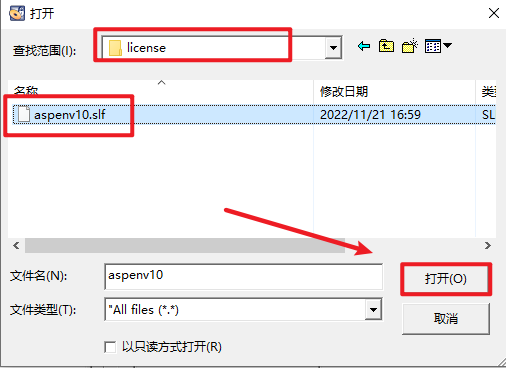 19.浏览选择“Crack—license“文件夹下的“aspenv10.slf“文件,点击“打开“,然后会加载证书,界面会显示无响应,是正常现象,耐心等待