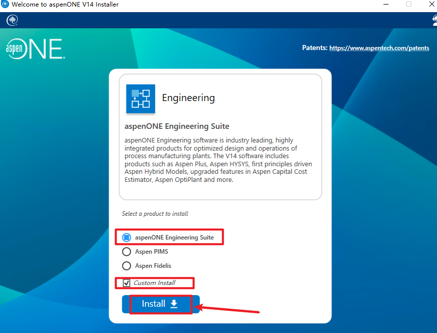 22.勾选”aspenONE Engineering Suite”,勾选”Custom Install”,点击”Install “