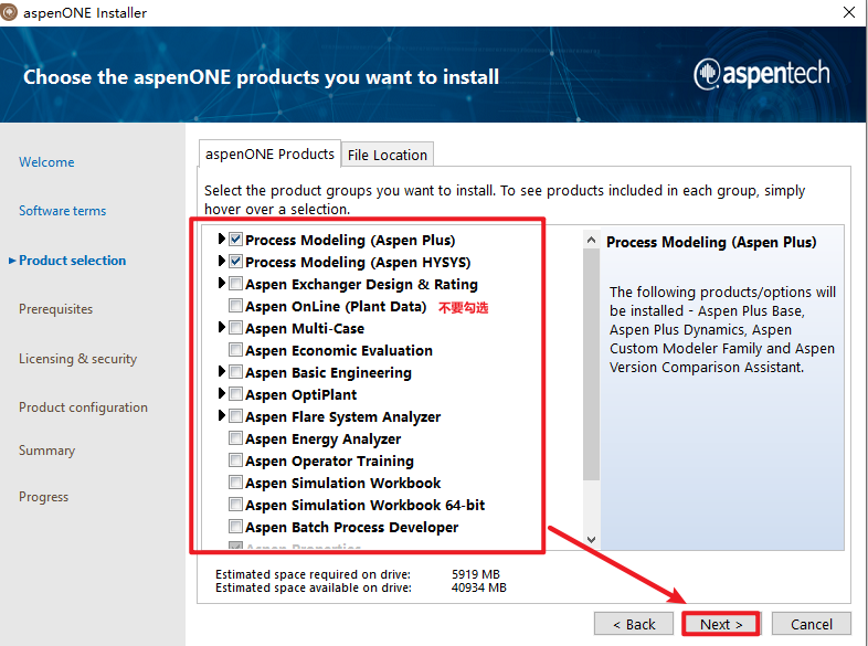 25.勾选需要安装的模块,不要勾选“Aspen OnLine (Plant Data)“项