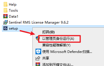 2.打开刚刚解压的文件夹,双击打开“Sentinel RMS License Manager 9.6.2”文件夹,找到并选中“Setup”右键选择“以管理员身份运行”