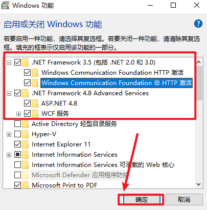 安装前需要安装有.NET Framework 3.5 或者更新的4.0 版本,如果没有安装请先安装 ,可以通过“控制面板-程序-启用或关闭Windows功能”,打开面板,勾选net 3.5和net 4.8,点击确定