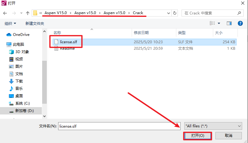 14.选择Aspen v15.0安装包里面的“Crack“文件夹下的“license.slf“文件,点击“打开“