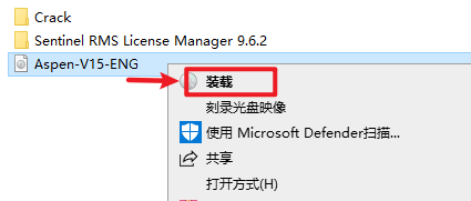 17.返回安装文件夹,选中“Aspen-V15-ENG”文件,右键选择“装载”(如果没有“装载”选项的可以右键选择“打开方式—Windows资源管理器”打开)