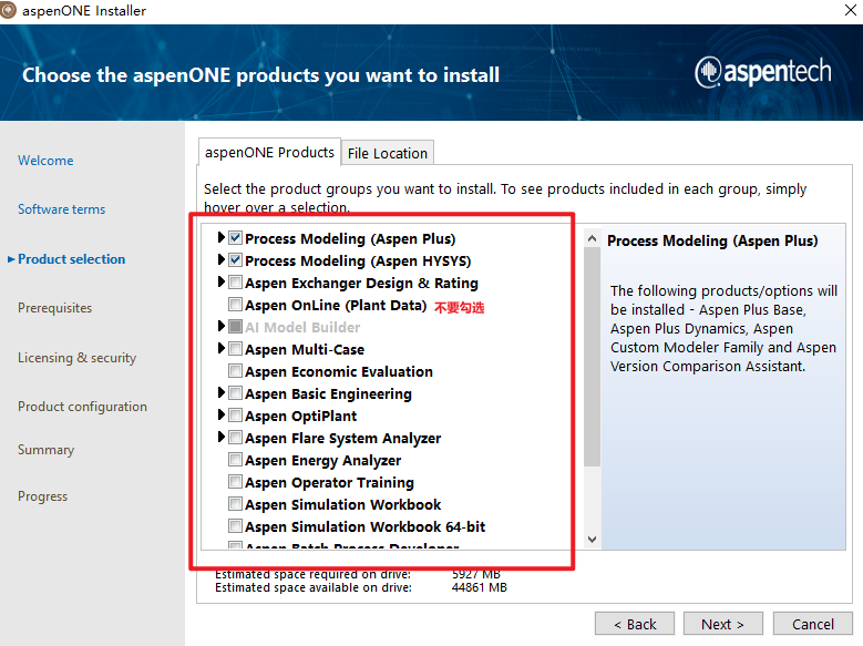 22.勾选需要安装的模块组件,不要勾选“Aspen OnLine (Plant Data)“项