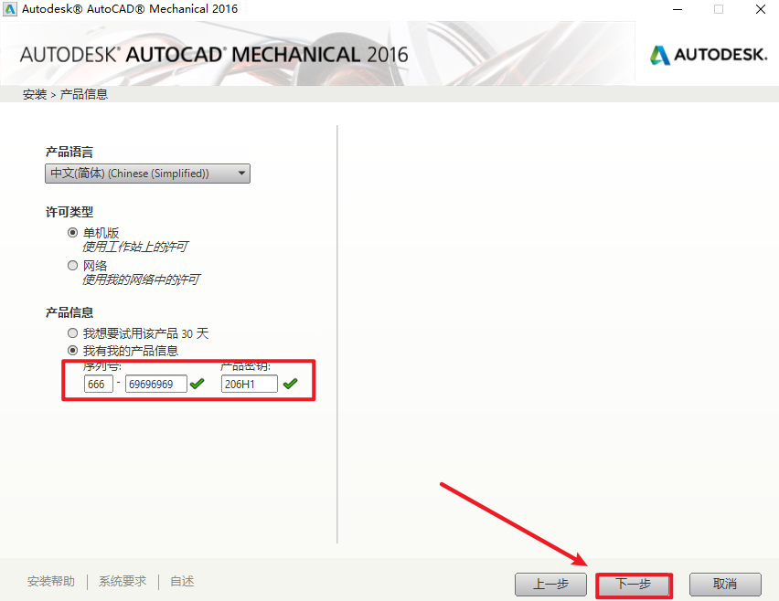 6.输入序列号:“666-69696969”,输入产品密钥:“206H1”,点击“下一步”
