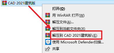 1.选中下载的压缩包,然后右键选择解压到“CAD 2021建筑版”