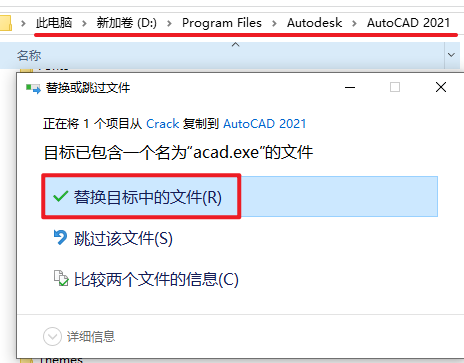 9.返回安装文件夹,双击打开“Crack”文件夹,复制“acad”文件