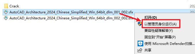 2.打开刚刚解压的文件夹,选中“AutoCAD_Architecture_2024_Chinese_Simplified_Win_64bit_dlm_001_002.sfx”文件鼠标右键选择“以管理员身份运行”