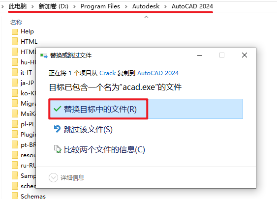 10.粘贴复制的文件到该路径下,选择“替换目标中的文件”