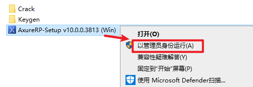 2.打开刚刚解压的文件夹,选中“AxureRP-Setup v10.0.0.3813 (Win)”右键选择“以管理员身份运行”