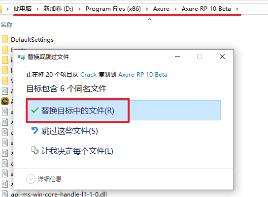 10.依次打开软件的安装路径:D:\Program Files (x86)\Axure\Axure RP 10 Beta,粘贴复制的文件到该路径下,选择“替换目标中的文件”