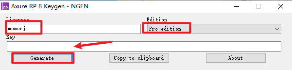 16.在“Licensee”栏输入任意字母,Edition栏下拉框选择“Pro Edition”,点击注册机左下角的“Generate”