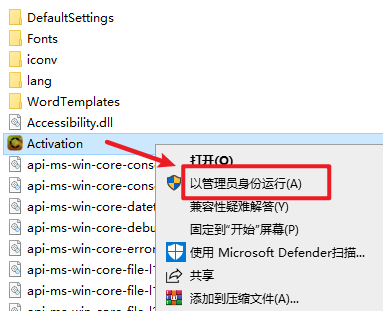 20.返回前面打开的软件的安装路径文件夹,找到并选中的“Activation”文件,右键选择”以管理员身份运行”