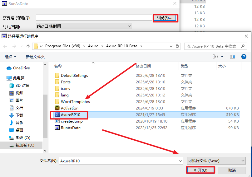 21.点击”浏览”选择“AxureRP10.exe”文件,点击”打开”