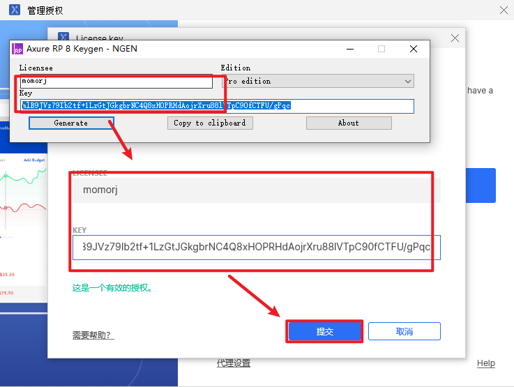17.将注册机上的“Licensee“和“Key“分别复制到软件管理授权界面上的“LICENSEE“和“KEY“栏,点击“提交“
