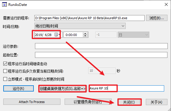 22.请填写2019年的日期,在创建桌面快捷方式后面框内填写“Axure RP 10”,点击“创建桌面快捷方式…”,点击右上角的关闭