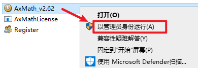 2.打开刚刚解压的文件夹,找到并选中“AxMath_v2.62”文件,右键选择“以管理员身份运行”