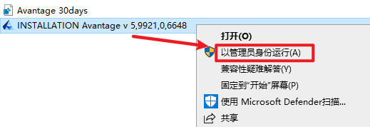 2.打开解压好的文件夹,选中“Avantage 5.9921安装包”,右击选择“以管理员身份运行”