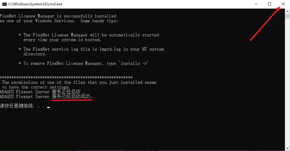5.提示”服务已经启动成功”后,点击右上角”X”关闭界面