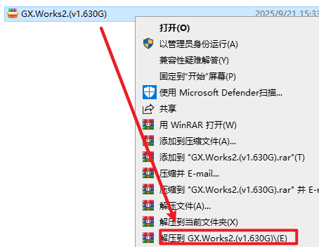 - 选中下载的压缩包,然后右键选择“解压到 GX Work2”