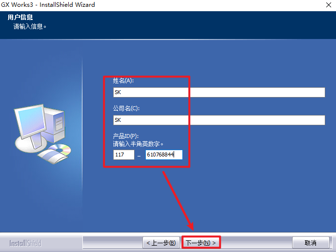 5.姓名、公司名填写:SK,产品ID输入:117-610768844,点击“下一步”