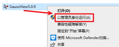 2.选中“GaussView5.0.9”,右键选择“以管理员身份运行”