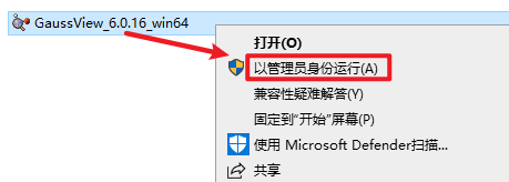 2.打开解压好的文件夹,选中“GaussView 6.0.16 win64”,右键选择“以管理员身份运行”