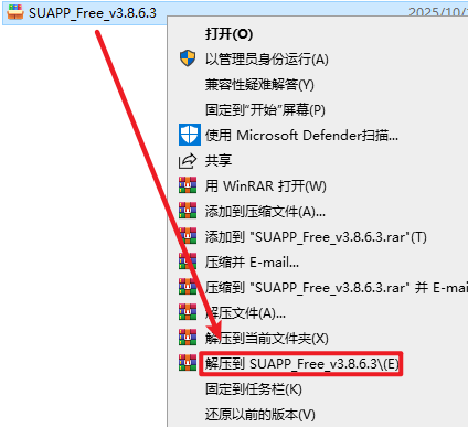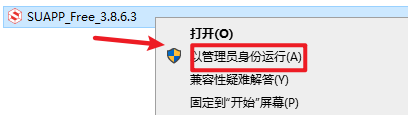 2.打开刚刚解压的文件夹,选中“SUAPP_Free_v3.8.6.3”文件,右击选择“以管理员身份运行”