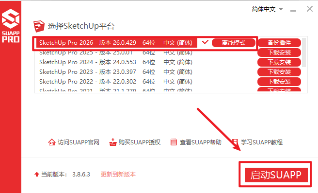 5.根据安装的SketchUp(草图大师)版本进行选择,点击“云端模式”切换成离线模式“,点击“启动SUAPP”