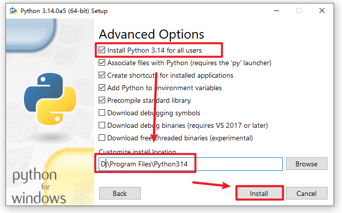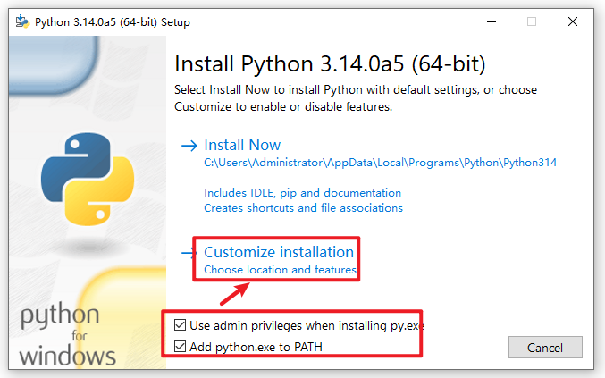 3.勾选“Add Python…“和“Use admin privileges….”,点击“Customize installation“