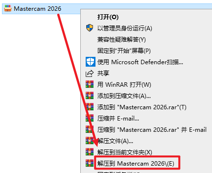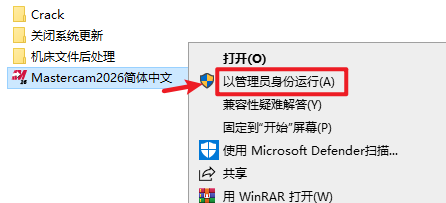 2.打开刚刚解压的文件夹,选中“Mastercam2026简体中文”,右键选择“以管理员身份运行”