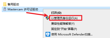11.返回安装文件夹,双击打开“Crack”文件夹,选中“Mastercam 许可证驱动”,右键选择 “以管理员身份运行”
