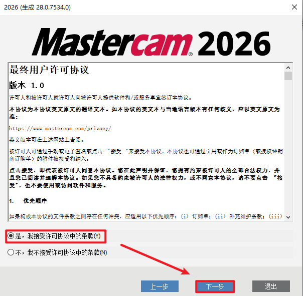 8.选择“是,我接受…”,点击”下一步“
