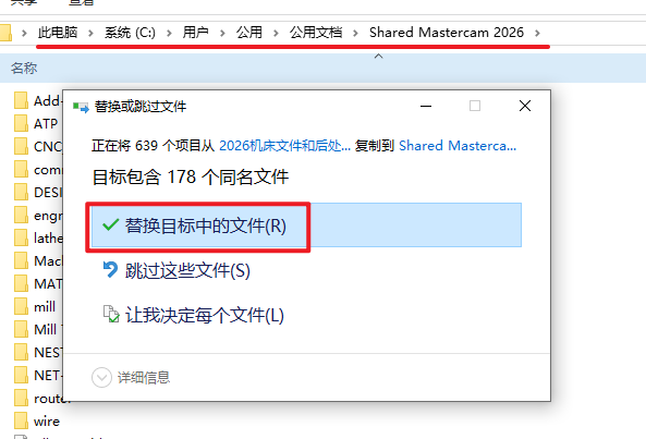 23.返回打开的“Shared Mastercam 2026”文件夹,粘贴复制的文件到该路线下,选择“替换目标中的文件”