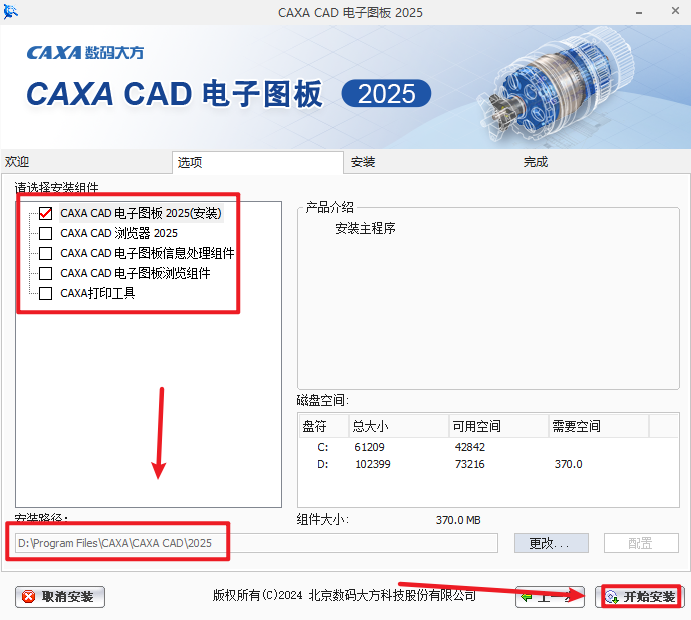 5.选择勾选需要安装的组件,选择软件安装路径,安装路径不要出现中文,点击“开始安装”