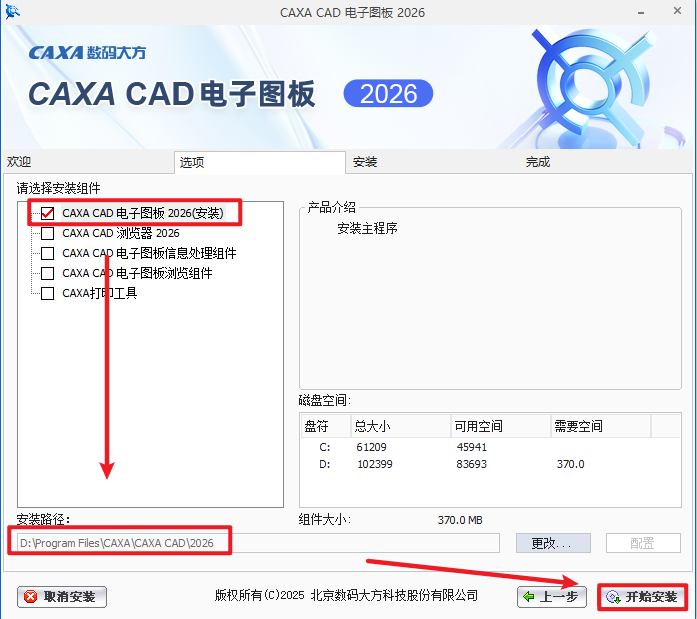 5.选择勾选需要安装的组件,选择软件安装路径,安装路径不要出现中文,点击“开始安装”