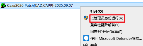 8.返回安装文件夹,双击打开“Crack”文件夹,选中 “Caxa2026 Patch[CAD,CAPP]-2025.09.07”右键选择“以管理员身份运行”