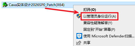 10.返回安装文件夹,双击打开“Crack”文件夹,选中“Caxa实体设计2026SP0_Patch(X64)”右键选择“以管理员身份运行”