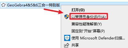 2.打开刚刚解压的文件夹,鼠标右键点击“GeoGebra4&5&6三合一特别版.exe”选择“以管理员身份运行”