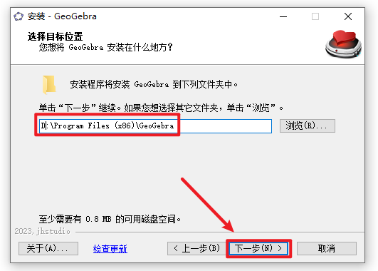 4.选择软件安装路径,建议和教程中的保持一致,本例安装到D盘(将路径地址中的首字符C改为D表示安装到D盘,安装路径不要出现中文),点击“下一步”