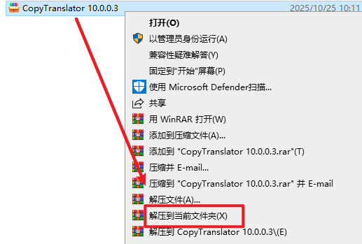 1.选中下载的压缩包,然后右键选择解压到“CopyTranslator V10.0.0.3”
