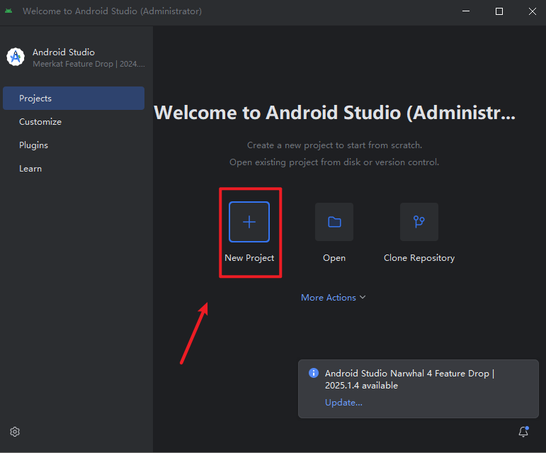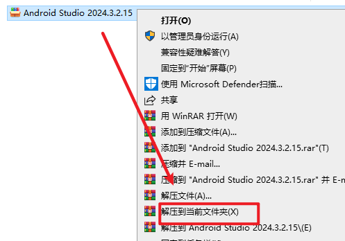 2.打开刚刚解压的文件夹,选中“android-studio-2024.3.2.15-windows”文件,右键选择“以管理员身份运行”