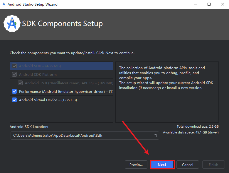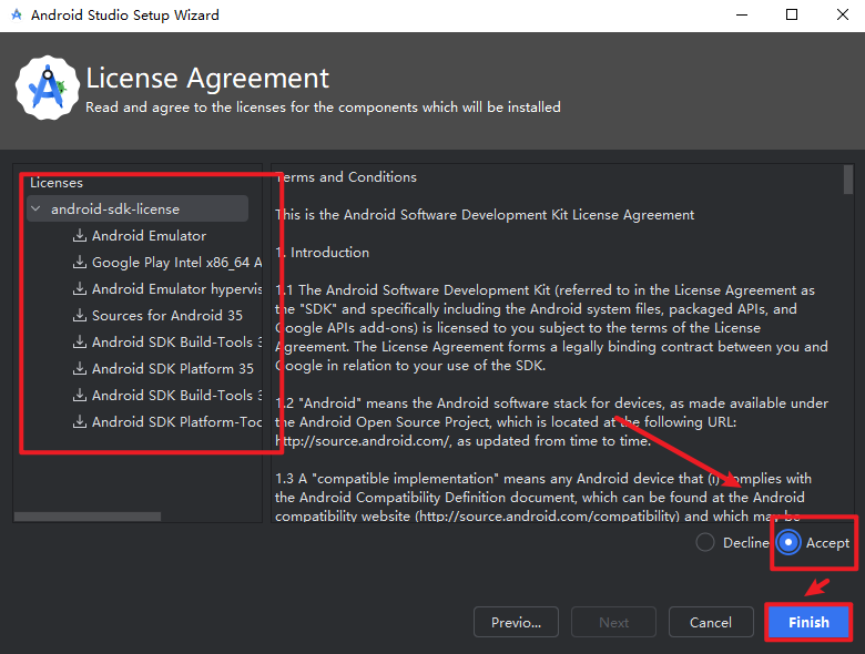 16.根据自己的需求选择SDK License,勾选“Accept”,点击“Finish“