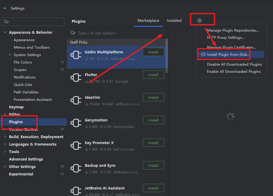 23.点击“Plugins“,点击设置图标,点击“Install…“