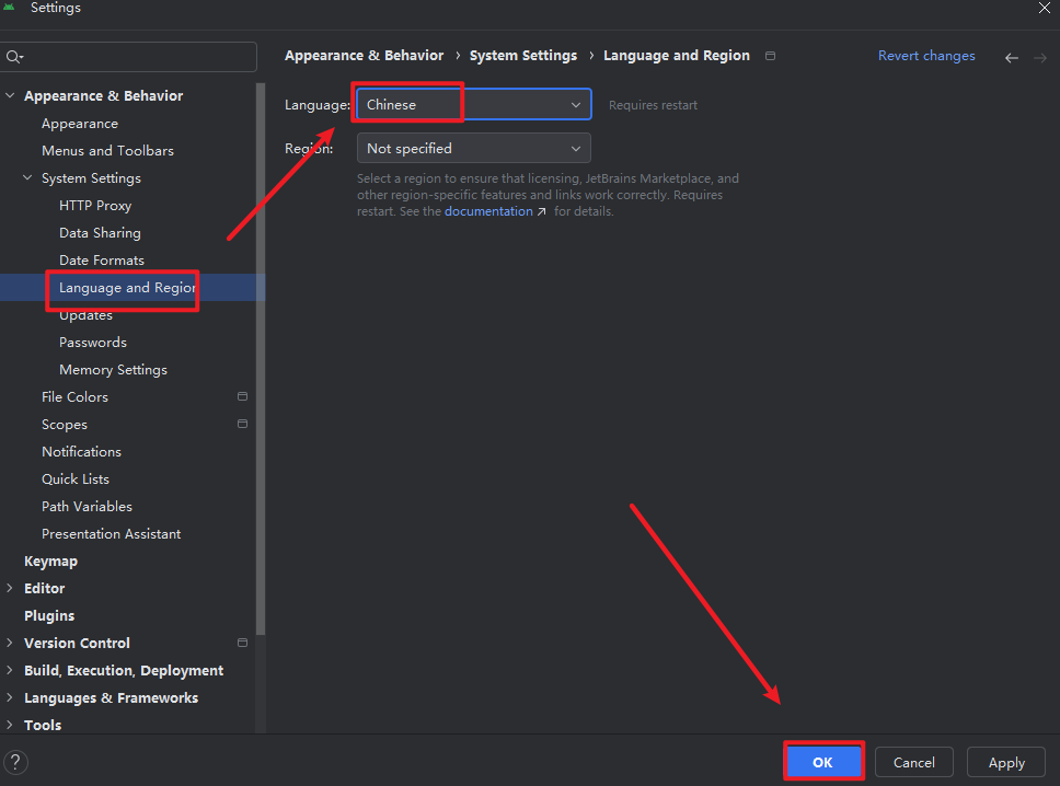 26.依次点击展开“Appearance & Behavior——System Settings”,点击“Language and Region”,语言Language选择“Chinese”,点击“OK“