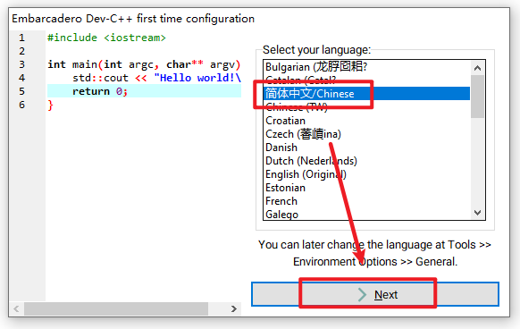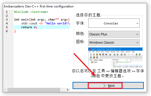 9.首次使用 Dev C++ 还需要简单的配置,包括设置语言、字体、和主题风格